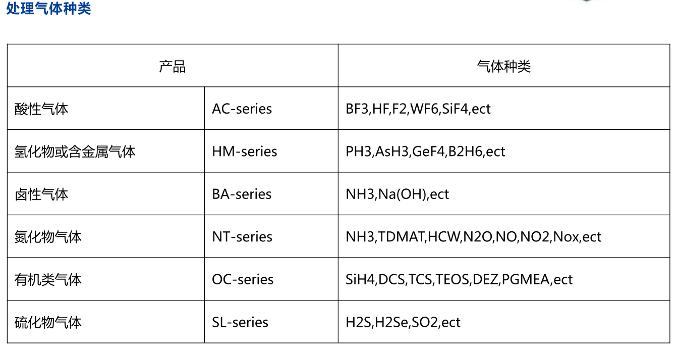 WFS-100F吸附式local scrubber 尾氣處理設備可處理氣體種類包括半導體、液晶以及太陽能等行業中蝕刻制程與化學氣相沉積制程中使用的特氣,主要包括SiH4、SiH2Cl2、PH3、B2H6、TEOS、H2、CO、NF3、SF6、C2F6、WF6、NH3、N2O等。