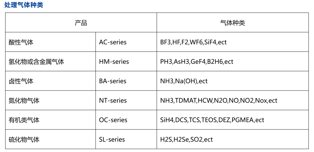WFS-100F吸附式local scrubber 尾氣處理設備可處理氣體種類包括半導體、液晶以及太陽能等行業中蝕刻制程與化學氣相沉積制程中使用的特氣,主要包括SiH4、SiH2Cl2、PH3、B2H6、TEOS、H2、CO、NF3、SF6、C2F6、WF6、NH3、N2O等。